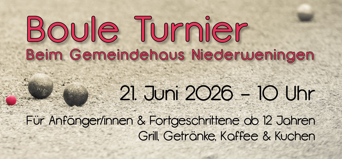 Auf dem Petanque Platz beim Bahnhof Niederweningen Dorf veranstalten wir am Sonntag, 21. Juni 2026 wieder ein Boule-Turnier für alle, die einen lockeren Anlass im französischen Stil miterleben möchten.